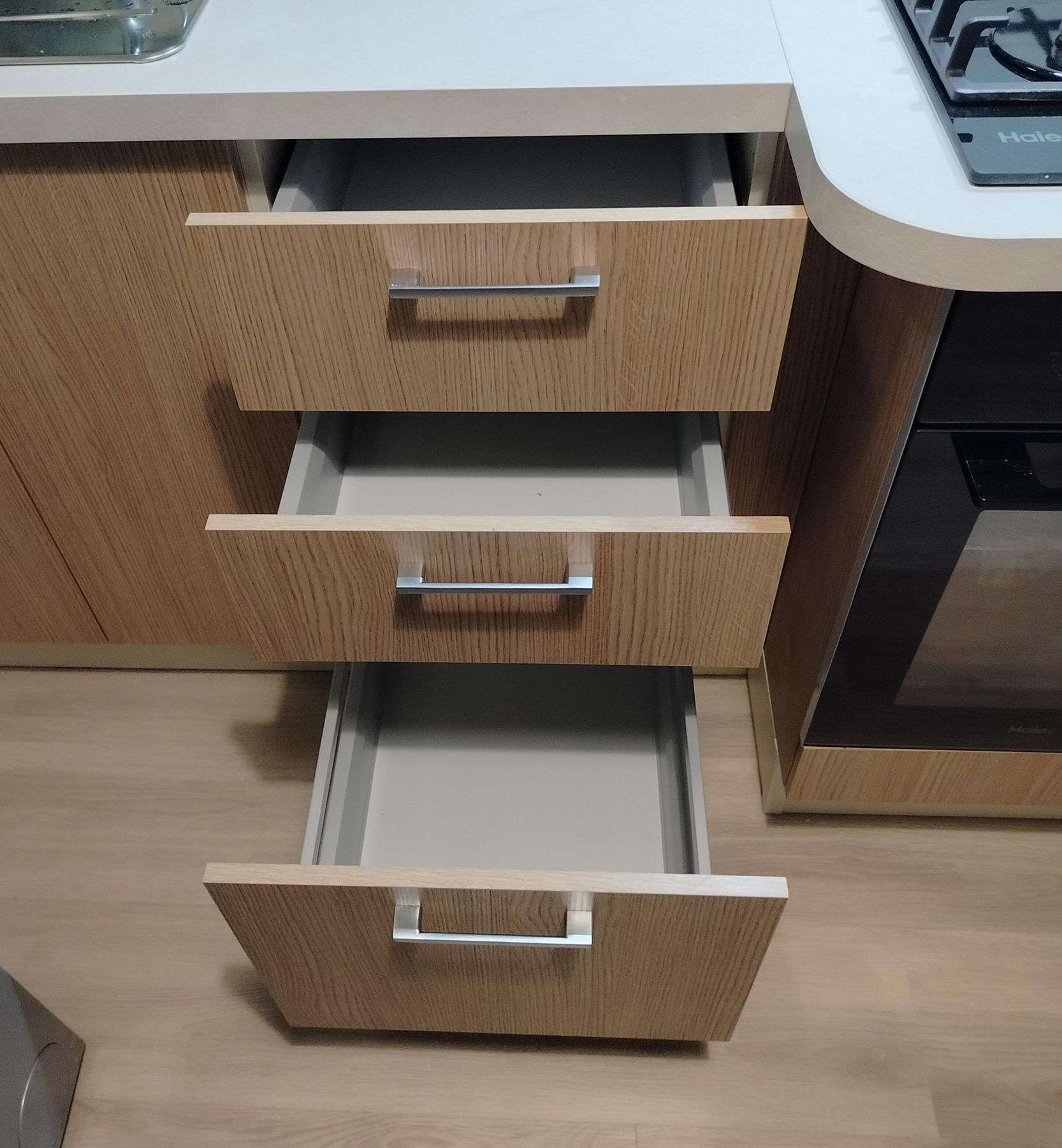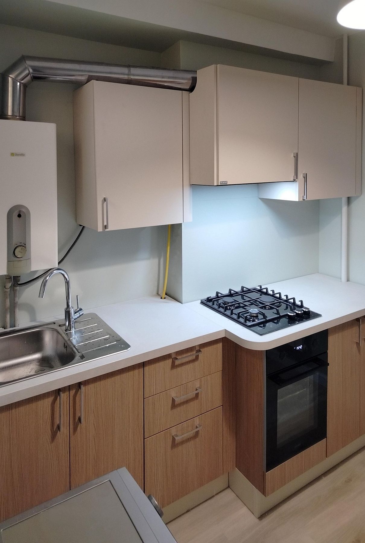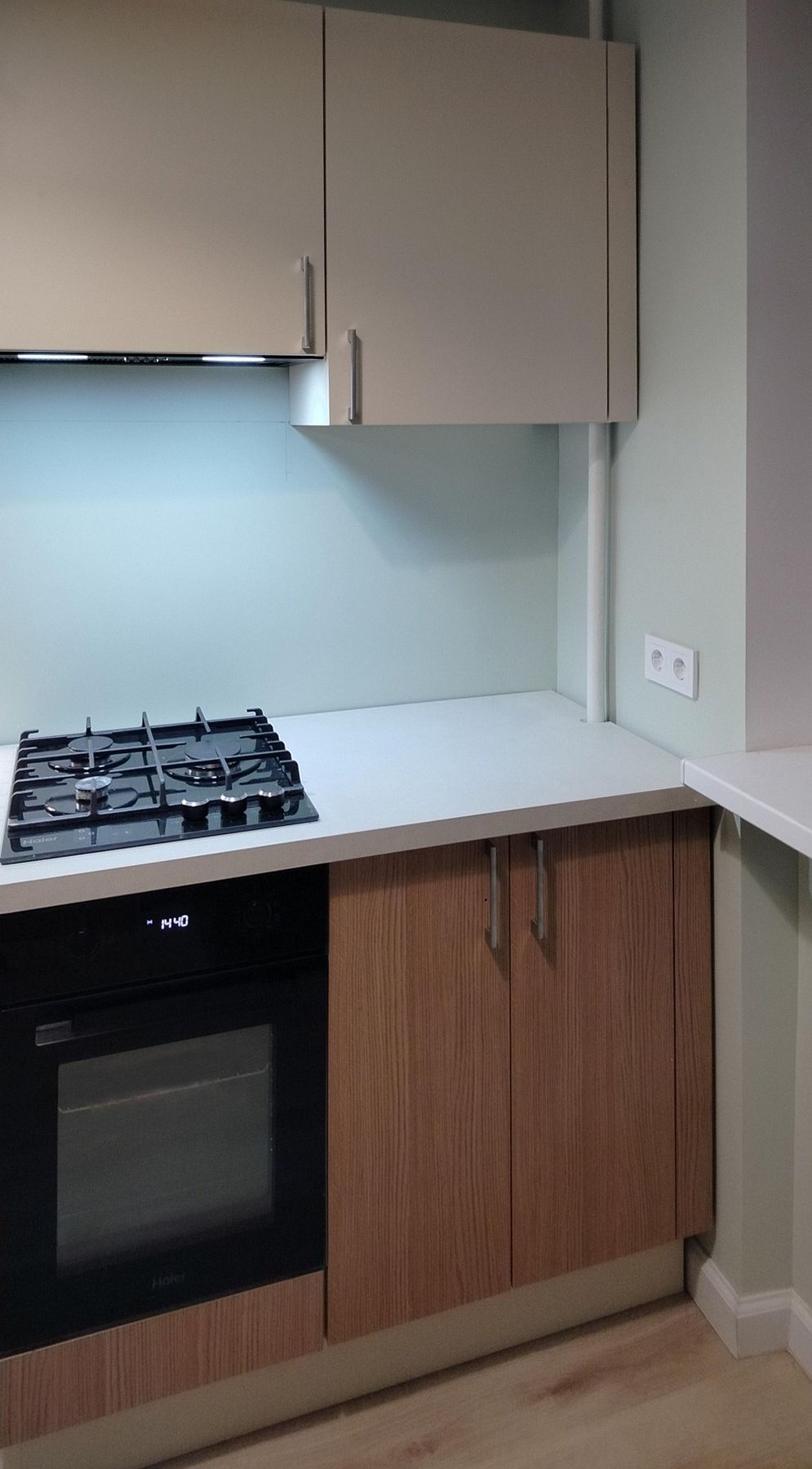 Нашим решением стала кухня модели Токио с двумя цветами фасадов, которая визуально облегчает пространство. Чтобы обойти трубы и сохранить эргономику, столешницу сделали на разном уровне по глубине с плавным переходом. Это позволило спрятать коммуникации за фасадами, не потеряв в полезной площади. Стиральная машина органично вписалась в общую композицию, не нарушая целостности интерьера. В итоге компактная кухня получилась светлой, удобной и полностью соответствующей пожеланиям клиента.